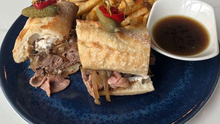 Smoked prime rib, caramelized onions, horseradish cream sauce, and au jus, side of house cut french fries.